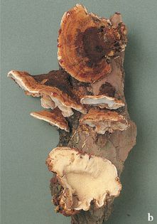 Benzoin Bracket Ischnoderma resinosum (Fr.) P. Karst. (illustrated 20% life size) Bracket 5–30×3–15cm across, 1–3cm thick, margin acute, single or in small tiers; zoned rusty brown to almost black; upper surface very uneven and wrinkled, velvety, saturated in a rusty resin when young, concentrically ridged. Flesh pale brownish; succulent; smell pleasant. Tubes 6–10mm long; brown. Pores 2–3 per mm, angular; creamy white, later ochre-brown. Spores 5–6×2–2.5¼, subcylindrical; white. Hyphal structure dimitic; generative hyphae with clamp connections. Habitat on dead coniferous and deciduous trees; autumn to winter. Uncommon. Not edible. Note many authorities now consider this species as Ischnoderma benzoinum (Wahlenb.) P. Karst. if it is found on coniferous, not deciduous, wood.