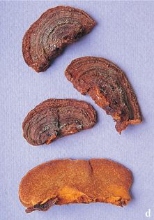 Phellinus pini (Thore) A. Ames. (illustrated 20% life size) Bracket 2–20cm across, 1–15cm thick; hoof- or fan-shaped, or shelf-like, generally curved; tawny to dark reddish-brown or brownish-black in age, margin often brighter; hard, crusty, rough or cracked, minutely hairy. Stem minute or absent. Flesh tough; tawny to tan or ochre. Tubes up to 6mm deep. Pores circular to angular; dingy yellow-tawny. Spores 4–6×3.5–5¼, globose or subglobose, smooth. Spore print brown. Habitat singly or in rows on living or recently dead coniferous trunks; perennial. Uncommon in Britain, most collections reported from Scotland. Not edible. Note this very destructive fungus attacks the heartwood of living trees, resulting in ‘conk rot’ and causing more timber losses than any other fungus.