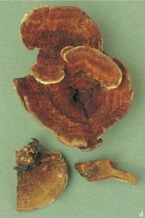 Shaggy Bracket Inonotus hispidus (Bull.) P. Karst. (illustrated 30% life size) Bracket 6–25cm×4–12cm across, 2–10cm thick, fan-shaped, usually single but occasionally fusing with others into overlapping groups; varying from ochraceous to tobacco-brown, finally blackish; surface felty-hairy, finally bristly. Flesh rusty brown. Tubes 10–30mm long. Pores 2–3 per mm, circular to angular; pale ochraceous at first, later brown and glancing in the light. Spores 9–12×4–10¼, subglobose; rust. Habitat usually on ash but commonly on other trees such as elm, apple and walnut; summer, but persisting in blackened state throughout the year. Frequent. Not edible.