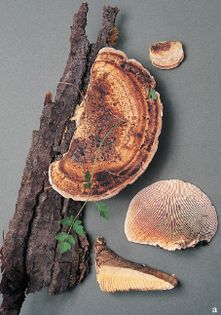 Birch Mazegill Lenzites betulinus (L.) Fr. (illustrated 70% life size) Bracket 3–8cm×2–4cm across, 0.3–1.5cm thick, semicircular or fan-shaped, often in overlapping groups; upper surface uneven, concentrically grooved and zoned, whitish, grey, tan, and brown, covered in fine hairs in which algae may grow, giving the surface a green tinge; tough and leathery. Flesh white; cottony. Gills forked and fused together in places; straw-yellow to buff-grey. Spores 5–6×1.5–3¼, subcylindrical; white. Hyphal structure trimitic. Habitat on deciduous trees, also on cut timber; all year. Frequent. Not edible.