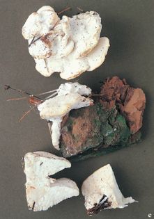 Bitter Bracket Postia stiptica (Pers.) Jülich syn. Oligoporus stipticus (Pers.) Gilb. & Ryvarden syn. Tyromyces stipticus (Pers.) Kotl. & Pouzar (illustrated 55% life size) Bracket 1–8cm×1–6.5cm across, 0.5–3.5cm thick, semicircular or kidney-shaped, single or in small overlapping groups; milk-white, causing a brown rot; upper surface uneven. Flesh taste bitter and stinging. Tubes 0.3–0.7mm long; white, exuding whitish droplets in humid weather, which dry cream. Pores 1–5mm across, circular becoming more elongate; white to cream. Spores 3.5–4.5×1.5–2.5¼, oblong-elliptical; white. Hyphal structure monomitic; generative hyphae with clamp connections. Habitat usually on dead conifers, less frequently on living trees; all year. Common. Not edible.