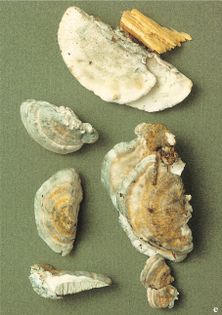 Blueing Bracket Postia subcaesia (A. David) Jülich syn. Oligoporus subcaesius (A. David) Gilb. & Ryvarden syn. Tyromyces subcaesius A. David (illustrated 60% life size) Bracket 1–6cm×1–4cm across, 0.3–1cm thick, semicircular, single or in overlapping groups; whitish, grey-blue with age or where handled, but not as blue as P. caesia (above); upper surface covered in fine, long hairs. Flesh white. Tubes 0.5–4.5mm long; white, later grey-blue. Pores 3–4 per mm, circular; white at first, more grey or grey-blue with age. Spores 4–5×0.7–1.5¼, sausage-shaped; white with grey-blue tint, amyloid. Hyphal structure monomitic, generative hyphae with clamp connections and appearing glassy in KOH. Habitat on fallen branches and sticks of deciduous trees in old woodland; all year. Frequent. Not edible. Note in my first book this picture was named as Tyromyces caesius. The fungi of this section that cause brown rot have been transferred from Tyromyces to Postia, and this species has only recently been split from P. caesia (above).