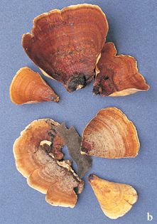 Stereum ostrea (Blume & Nees) Fr. (illustrated 50% life size) Fruit body 1–10cm across, irregular, semicircular or bracket-like, often overlapping; zonate and multicoloured in shades of brown and rust; densely hairy. Fertile lower surface pale buff; smooth. Flesh thin, tough, leathery. Spores 5.5–7.5×2–3¼, cylindrical, smooth. Spore print white. Habitat reported from decayed wood in greenhouses; all year. Very rare, with British records not confirmed, but is a common tropical species. Not edible.