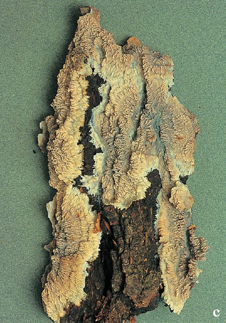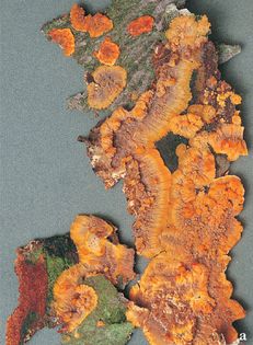 Wrinkled Crust Phlebia radiata Fr. syn. P. merismoides (Fr.) Fr. (illustrated (a) 45% life size) Fruit body resupinate, forming round, oval or irregular patches 8–10mm across, 2–3mm thick, margin fringed; colour varying from dull flesh-colour or purplish to bright fluorescent orange, especially at the margin, becoming greyish-orange to almost white with age; on cherry trees it is often pale lilaceous; surface very wrinkled, with radiating ridges. Spores 4–7×1–3¼, sausage-shaped; white. Habitat on the bark of dead deciduous trees, especially beech; all year. Common. Not edible.