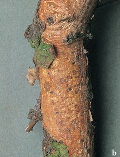 Waxy Crust Vuilleminia comedens (Nees) Maire syn. Corticium comedens (Nees) Fr. (illustrated 60% life size) Fruit body resupinate, forming firm to gelatinous patches 1–13cm across below the bark; dingy lilac to pale flesh-coloured, slightly viscid and translucent when moist. Spores 18–20×5–6¼, cylindrical to sausage-shaped; white. Habitat beneath the bark on dead, often still attached, branches of deciduous trees; all year. Common but inconspicuous; most easily found by looking for the characteristic rolled-back bark of the host. Not edible.