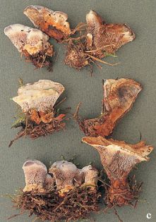 Blue Tooth Hydnellum caeruleum (Hornem.) P. Karst. (illustrated 35% life size) Fruit body single or fused with others. Cap 3–11cm across, convex to depressed; at first white, often with a blue margin, at length yellowish- to rusty-brown; velvety to matted. Flesh zoned bluish in cap, orange-brown in stem; smell of cucumber when cut. Spines 1–5mm long; bluish then white, finally purplish-brown. Spores 5.5–6×3.5–4.5¼, irregularly lobed and warted. Spore print brown. Hyphae with clamp connections. Habitat conifer woods, confined to Highland pine forest; autumn. Uncommon. Vulnerable on Red Data List, a conserved species on the Biodiversity Action Plan. Not edible.