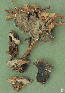 Black Tooth Phellodon niger (Fr.) P. Karst. (illustrated 40% life size) Fruit bodies mostly fused together. Cap 3–7cm across, flat or more often centrally depressed, margin lobed; whitish then pale grey with lilaceous tints, soon purplish-black or black, often with olivaceous tints on ageing, usually concentrically zoned; velvety or downy, then pitted or covered in roughened points, ridged and fibrillose towards margin. Stem 10–50×5–20mm, often swollen towards base, rooting or arising from a mycelial pad with a central, black, woody core; velvety tomentum is black at first then grey, grey-brown, or olivaceous. Spines 1–3mm long; blue-grey at first, finally grey. Spores 3.5–4.5×2.5–3.5¼, subglobose, spiny. Spore print white. Habitat usually in coniferous woods; autumn. Uncommon, rare on Red Data List. Unknown edibility.