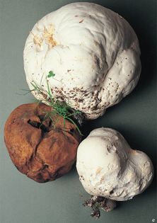 Giant Puffball Calvatia gigantea (Batsch) Lloyd syn. Langermannia gigantea (Batsch) Rostk. (illustrated (c) 20% life size) Fruit body 7–80cm across, subglobose; whitish; leathery outer wall breaking away to expose the spore mass; attached to the substrate by a root-like mycelial cord which breaks, leaving the body free to roll around and scatter the spores. Gleba powdery and olivaceous-brown at maturity; sterile base rudimentary or absent. Spores 3.5–5.5¼ in diameter, globose, finely warted; tawny brown. Habitat in gardens, pasture, and woods; summer to autumn. Common. Edible when still white and firm, good.