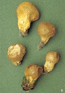 Grassland Puffball Lycoperdon lividum Pers. syn. L. spadiceum Pers. (illustrated 70% life size) Fruit body 1–2.5cm across, subglobose, pinched into a short stem; greyish- to ochre-brown; outer layer scurfy, inner wall thin and granular, opening by a small, irregular pore. Gleba finally olive-brown; sterile base occupying up to a third of the volume of the fruit body; whitish at first then yellowing, finally brownish; spongy, of rather large cells. Spores 4¼ in diameter, globose, minutely warted; olive-brown. Habitat on heaths, pasture, dunes, and waste ground on sandy soil; autumn. Frequent in coastal areas. Unknown edibility.