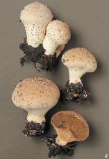 Common Puffball Lycoperdon perlatum Pers. (illustrated 60% life size) Fruit body 2.5–6cm across, 2–9cm high, subglobose with distinct stem; white, becoming yellowish-brown; outer layer of short pyramidal warts, especially dense on the head, rubbing off to leave an indistinct mesh-like pattern; inner wall opening by a pore. Gleba olive-brown at maturity; sterile base spongy, occupying the stem. Spores 3.5–4.5¼, globose, minutely warted; olivaceous-brown. Habitat in woodland; summer to late autumn. Very common. Edible when young.