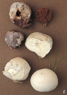 Grey Puffball Bovista plumbea Pers. (illustrated 65% life size) Fruit body 2–3cm across, subglobose, attached to substrate by a clump of fibres which often break, leaving the fruit body free to roll in the wind; outer wall white, flaking off in large scales at maturity; inner layer lead-coloured, fragile, opening by a circular pore. Gleba clay to olive-brown; sterile base absent. Capillitium of highly branched, brown, dendroid elements. Spores 4.5–6×4.5–5.5¼, oval with a long pedicel, finely roughened; brown. Habitat in short grass on lawns, golf-courses and pasture; late summer to late autumn. Common. Edible when young.