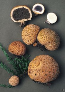 Common Earthball Scleroderma citrinum Pers. (illustrated 50% life size) Fruit body 2–10cm across, subglobose, attached to the substrate by cord-like mycelial threads; outer wall dirty yellow to ochre-brown, thick and tough, coarsely scaly, breaking open irregularly. Gleba purplish-black at first and patterned by whitish veins, becoming powdery when mature. Spores 9–13¼ in diameter, globose, with a net-like ornamentation; brown. Habitat on mossy or peaty ground on heaths or in rich woodland, especially those on sandy soil; late summer to early winter. Very common. Not edible. Note this species is sometimes parasitized by the fungus Pseudoboletus parasiticus.