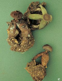 Arched Earthstar Geastrum fornicatum (Huds.) Hook. (illustrated 50% life size) Fruit body borne on a short stalk, splitting into 4 tall, narrow, downward-pointing rays, which stand on the tips a cup-like structure at the base of the fungus formed by 4 similar but shorter, broader, upward-pointing rays. Spore sac 1–1.5cm across, globose, with fringed apical pore; brownish. Spores 3.5–4.5¼ in diameter, globose, warted. Spore mass blackish-brown. Habitat deciduous woods; autumn. Uncommon, vulnerable on Red Data List. Not edible.