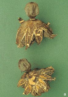 Geastrum coronatum Pers. (illustrated 50% life size) Fruit body opening to 5–9cm across; outer wall splitting into 5–8 pointed rays which curve downward and become irregularly cracked. Spore sac on a short, thick stalk, subglobose, opening by a central pore; grey-brown. Spores 3.5–4.5¼ in diameter, globose, warted. Spore mass dark brown. Habitat on soil in coniferous or deciduous woods; autumn. Uncommon. Not edible.