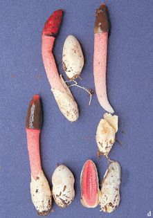 Mutinus ravenelii (Berk. & M.J. Curtis) E. Fisch. (illustrated 60% life size) Fruit body initially 1–2cm across, egg-like, semi-submerged; white to rose-pink; ruptured by the spongy, spore-bearing, stalk-like receptacle, 100–180×10–20mm, tapering at apex to an acute point, with small opening at tip; bright carmine-red, fading at base; upper half covered in dark olive to blackish spore mass, which soon liquefies and smells strong, sickly sweet or metallic, but not especially unpleasant. Spores 4–7×2–3¼, elliptical, smooth; brown. Habitat in leaf litter, woody debris, and rich soil; summer to autumn. Very rare. Said to be edible in egg stage but not recommended.