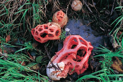 Red Cage Clathrus ruber Pers. (illustrated 35% life size) Fruit body egg-shaped, white to greyish volva, bursting open to show a lattice, 10×6cm, orange-red with greenish-black spore-bearing material on the inside; the mycelium commonly forms into ‘rooting’ rhizomorphs. Flesh spongy, rather brittle; smell strong, fetid, attractive to flies. Spores 4.5–5.5×2–2.5¼; olive-brown. Habitat in gardens and on rubbish heaps throughout Europe; late summer to autumn. Uncommon, rare in the north. Not edible.