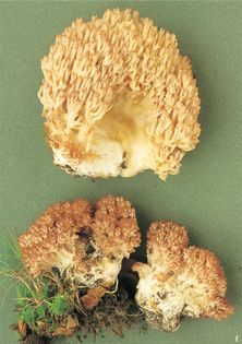 Rosso Coral Ramaria botrytis (Pers.) Ricken (illustrated 55% life size) Fruit body 7–15cm high, 6–20cm wide, with numerous thick, much-branched, crowded branches; white, becoming tan or ochraceous with pink, red, or purplish tips. Stem 3–4×1.5–6cm, stout. Flesh taste and smell pleasant, fruity. Spores 14–18×4.5–5.5¼, oblong-elliptical, longitudinally striate; ochraceous. Habitat on the ground in broad-leaved woods; late summer to late autumn. Rare. Edible.