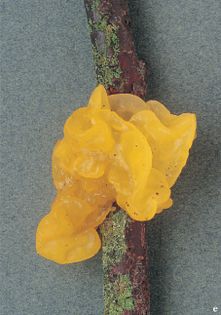 Yellow Brain Tremella mesenterica Retz. (illustrated 80% life size) Fruit body 2–10cm across, comprising flabby, soft lobes and folds; golden-yellow to orange, drying dark orange; gelatinous, drying horny, brittle. Spores 7–10×6–10¼, broadly ovate to subglobose; white. Basidia resembling hot cross buns from above. Habitat on dead deciduous branches, sometimes still attached to the tree; all year, especially late autumn. Very common. Not edible. Note occurs only as a parasite on species of Peniophora. The Peniophora may not be seen, as the Tremella can occur on the mycelium before fruiting. All Tremella species might occur in the same manner.