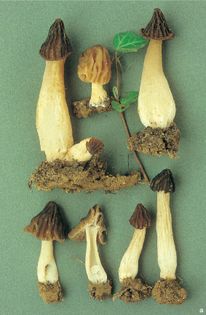 Semifree Morel Morchella semilibera DC. syn. Mitrophora semilibera (DC) Lév. (illustrated 70% life size) Cap 2–4cm high, conical, with more or less vertical, membranous ridges, the lower part free of the stem as shown, unlike others in the genus, in which it is attached to the stem; dark olive-brown. Stem 40–80×15–25mm, cylindrical; whitish-cream; hollow, the surface scurfy. Spores 22–30×14–18¼. Asci 450×25¼. Habitat in damp woodland; spring. Occasional. Said to be edible but it can cause stomach upsets.