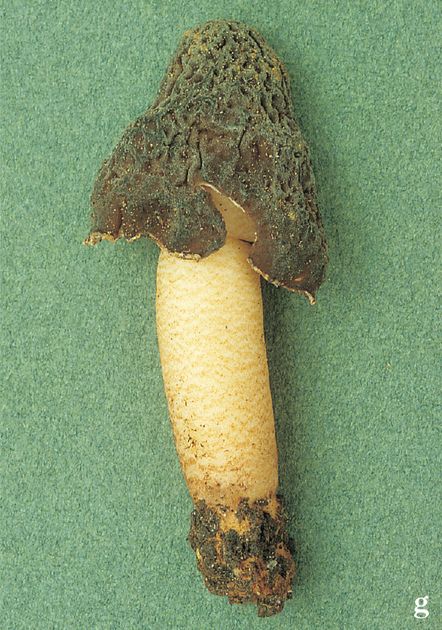 Thimble Morel Verpa conica (O. F. Müll.) Sw. (illustrated (f) 60% life size) Fruit body 4–9cm high. Cap pendulous, ovoid at first, then becoming bell-shaped, attached to the stem at centre; dark olive-brown. Stem cylindrical; whitish, covered in brownish granules arranged in irregular horizontal bands. Spores 20–24×12–14¼, elliptical. Asci 350×23¼. Habitat under hawthorn scrub on chalk soil; late spring. Occasional. Said to be edible but not worthwhile.