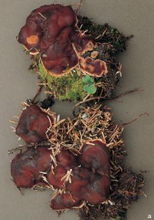 Pine Firefungus Rhizina undulata Fr. syn. R. inflata (Schaeff.) Quél. (illustrated 60% life size) Fruit body 4–12cm across, 2–8cm high, irregularly lobed, wavy cushions, attached to substrate by numerous whitish rhizoids growing down from the underside; chestnut-brown to black, margin paler. Flesh reddish-brown; tough, thick. Spores 22–40×8–11¼, fusiform, containing 2 or more oil drops. Asci 400×20¼. Habitat on conifer debris, especially on fire sites; early summer to autumn. Occasional. Not edible. Note causes ‘group dying’, a serious disease of conifers.