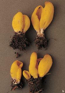 Otidea cantharella (Fr.) Quél. syn Flavoscypha cantharella (Fr.) Häffner (illustrated 90% life size) Cup 1–5cm high, elongate ear-shaped; bright sulphur-yellow, base whitish. Flesh white; thin. Spores 10–12×5–6¼, elliptical, containing 2 oil drops. Asci 150×10¼, not blued by iodine. Paraphyses slender, curved at the tip. Habitat in soil on roadsides and in parks and mixed woods; late summer to autumn. Very rare, rare on Red Data List. Not edible.
