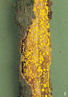 Lemon Disco Bisporella citrina (Batsch) Korf & S.E. Carp. syn. Calycella citrina (Hedw.) Boud. (illustrated 65% life size) Fruit body 0.5–3mm across, saucer-shaped, tapered below to small base; bright yellow, becoming orange-yellow when old or dried; exterior smooth. Spores 9–14×3–5¼, elliptical, often becoming 1-septate, containing 2 oil drops at each end. Asci 135×10¼. Habitat gregarious in dense swarms on dead wood of deciduous trees; autumn. Common. Not edible.