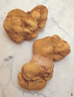 Italian White Truffle Tuber magnatum Pico (illustrated life size) Fruit body 3–16cm across, potato-shaped or spherical; white or creamy; smooth. Flesh creamy; firm; taste nutty, smell strong, typical truffle smell. Spores 35–50×32–42¼, elliptical, reticulate. Asci 60–120×40–100¼, 1- to 3-spored. Habitat in deciduous woods in northern Italy and patchily in the Balkans, not recorded for Britain; autumn. Edible excellent, considered the best truffle by the Italians.