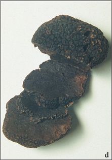 Perigord Truffle, Black Truffle Tuber melanosporum Vittad. (illustrated 60% life size) Fruit body as for T. aestivum (opposite), but covered with polygonal warts. Flesh turning violaceous-black when cut. Spores 29–55×22–35¼, elliptical, spiny. Spore print brown. Habitat in deciduous woods; autumn to early spring. A speciality of the Perigord region of France, but also occurring in other countries around the Mediterranean, north Africa, and Asia; probably not British, although there is one record in the Kew herbarium. Edible excellent, considered the best truffle by the French.