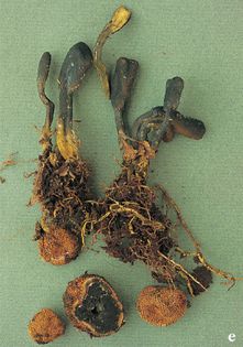 Snaketongue Truffleclub Cordyceps ophioglossoides (Ehr.) Link (illustrated 50% life size) Fruit body 3–10cm high, fertile head club-shaped, yellow and smooth, later black and finely roughened, tapering into a smooth, yellow stem. Spores breaking into 2.5–5×2¼ elliptical-cylindrical part-spores. Habitat as a parasite on species of Elaphomyces (opposite); autumn. Occasional. Not edible.