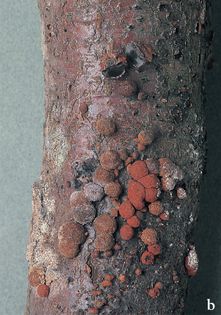 Beech Woodwart Hypoxylon fragiforme (Scop.) J. Kickx (illustrated 75% life size) Fruit body 0.1–1cm across, hemispherical; bright salmon-pink at first, becoming brick-red, later blackening; surface finely warted. Flesh blackish; hard. Spores 11–15×5–7¼, subfusiform, containing 1–3 oil drops; dark brown. Asci 150×8¼, cylindrical. Habitat gregarious on dead beech; late summer to early spring. Very common. Not edible.