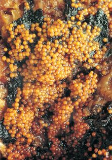 Nectria peziza (Tode) Fr. (illustrated twice life size) Fruit body 0.2–0.4mm across, globose when fresh, collapsing into a cup-like shape when dry (not shown); bright yellow. Spores 12–15×5–7¼. Asci 75–90×8–10¼. Habitat on rotting polypores and rotten wood, shown here on old Polyporus squamosus; all year. Occasional. Not edible.