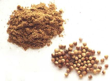 These spherical seeds can vary when ripe from pale green to cream or brown, but can also be bought ground into a powder. They taste rather like orange peel, and in India tend to be roasted, which brings out a more curry-like flavour. Coriander is a basic spice in Indian curries but is also used for pickles and sweet dishes, including certain types of cake. It is a mild spice and should therefore be used in relatively large quantities.