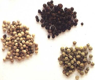 The common black pepper we use at the table. It is available as whole green, black or white peppercorns and as black or white powder. The green corns, or berries, are picked from the pepper vine plant, and then sun-dried, which turns them black. The white peppercorns are simply green peppercorns which have been left to ripen fully. Green peppercorns have a fresh and pungent flavour and are usually sold pickled in brine. Black and white pepper are similar in flavour, but the black is the more pungent of the two. Pepper can be used on virtually any savoury dish.