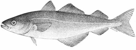 Maximum length 120 cm, usual adult length 60 to 90 cm. The back is usually greenish brown although sometimes of a charcoal colour (hence coalfish, from col, charcoal). This species spans the Atlantic in northern waters, descending as far as New Jersey in the west and the English Channel in the east. The importance of the saithe is attested by the extraordinary number of vernacular names for it. Day listed fifty-seven for Britain. In any community where it is well known, one is likely to find several names, corresponding to the different sizes. In Shetland, for example, the small ones, about 10 cm long, are sillock or sillack; while year-old specimens, about 20 to 25 cm long, are piltock. In Orkney the latter are cuithe and the next size up (40 cm) are harben. In both places the full-grown fish are saithe. One of the many similar progressions in Ireland is from gilpin to blockan to greylord to glashan.