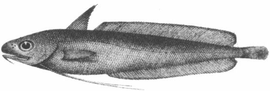 Maximum length 75 cm. A brownish fish. The dorsal, tail and anal fins are edged with black. This fish is called forkbeard because the pelvic fins are long and forked and look faintly like a beard. The characteristic is shared by a number of related species. Two of these which occur in North American waters are shown on the next page. The fork-beards have one relation which is sufficiently amusing to warrant being mentioned. This is the TADPOLE-FISH, shown below. Its scientific name is Raniceps raninus (Linnaeus). It only attains a length of 30 cm and is tadpole-coloured as well as tadpole-shaped. It is widespread but uncommon around the British coasts; but quite common in Norwegian waters. The Norwegians call it paddetorsk.