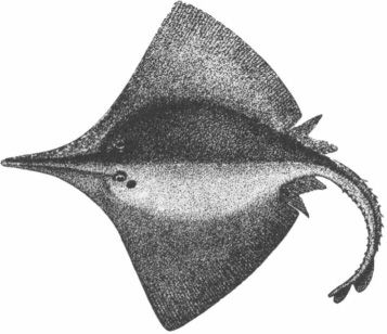Note the long snout. That of Dipturus oxyrhinchus Linnaeus, is even longer; so it is called the LONG-NOSE SKATE. This is known in France as pocheteau noir, or as raie capucin, after the hood of a Capucin friar, or by the mysterious name tyre, at Boulogne.