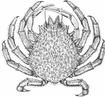 REMARKS Maximum size (for the carapace) 25 cm by 18 cm. The colour varies from reddish orange to brown. The arrangement of the legs makes one think of a spider. This species does not occur on the American Atlantic coast, although other spider crabs (not normally eaten) do. They all have a remarkable ability to disguise themselves.
