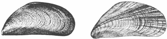 This species has an extensive range, from the southern Arctic down to North Carolina and the Mediterranean. Until recently it was thought that the so-called Mediterranean mussel, which is found as far north as Britain, was a separate species, Mytilus galloprovincialis Lamarck. It has a less angular shell and the mantle-edge of live specimens is dark instead of white or pale. But it is now counted as a race or variety of the main species.