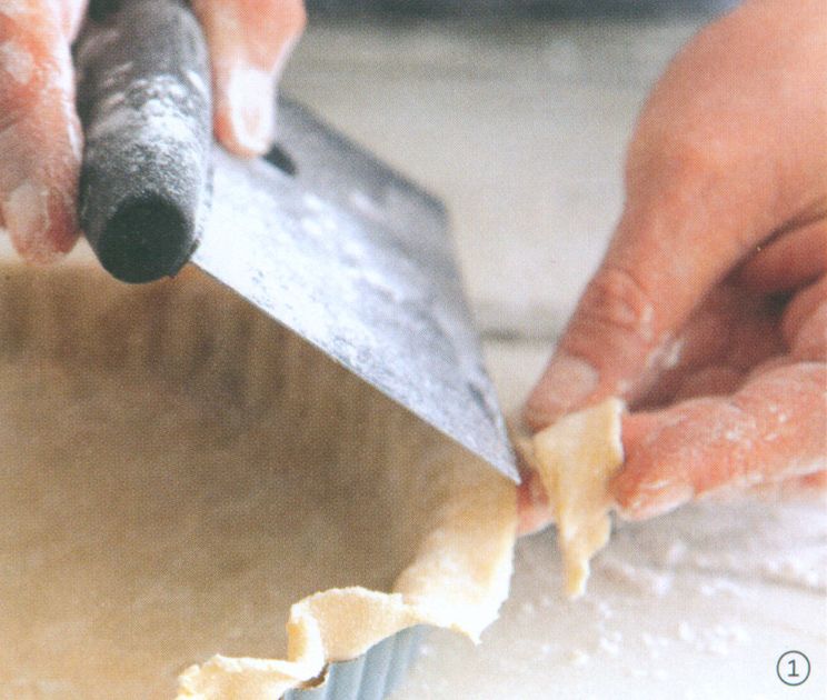 If you are making a tart with any type of dough or a pie with a cookie crust, even off the top edge of the crust by pressing it in against the side of the crust with your thumb and down with your index finger at the same time .