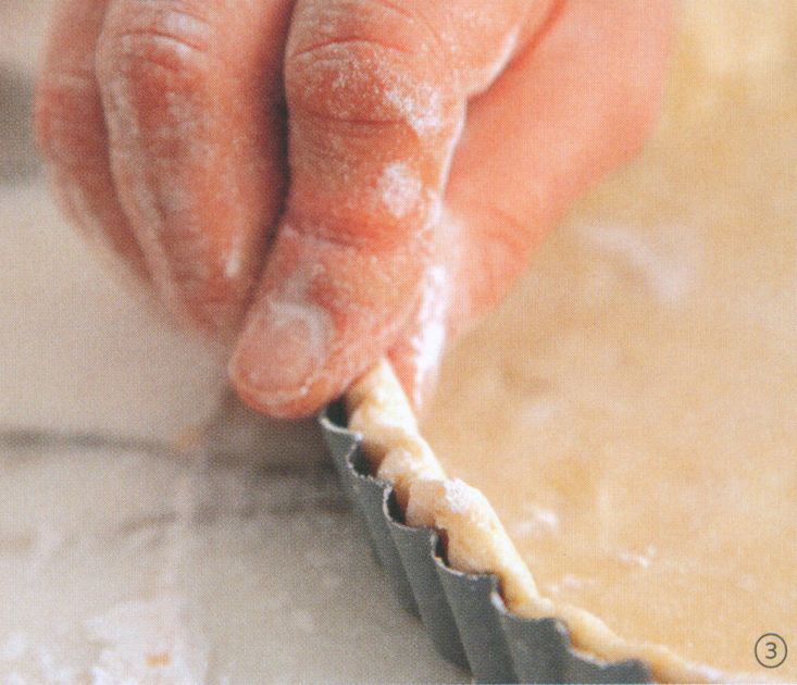 For a tart tin, once the dough is in the tin, lift the edges and ease the dough into place from the edge inward. Never stretch dough to conform to the shape of the tin, or it will shrink back while baking.