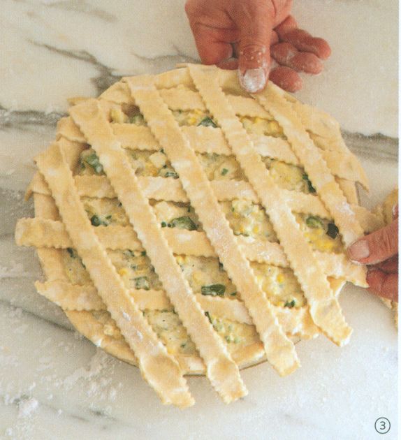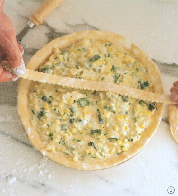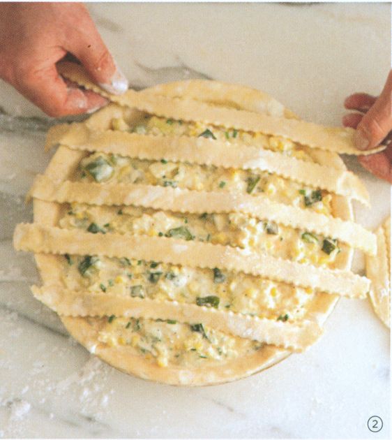 Turn the pie 45° and arrange another strip across the diameter, at an angle to the first strips .