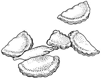 May be made following either the first or second methods for ravioli. However, agnolotti are larger than ravioli, 2 or even 3 inches square. Therefore, use more ripieno (about ¾ teaspoon to 1 teaspoon). Each portion of ripieno should be the size of a large olive. Also, the balls of ripieno should be 2 to 3 inches apart, since your agnolotti should have much more sfoglia surrounding the ripieno in the center.