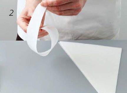 Cut a sheet of silicone baking paper into triangles; make sure that you have one longer side and two smaller sides. (1) Position the paper in front of you with the middle corner pointing towards you and the long side of the triangle facing away from you.
