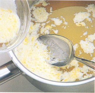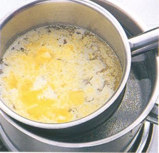 To make 100 g (3¼ oz) clarified butter, cut 180 g (5¾ oz) butter into small cubes. Place in a small pan set in a larger pot of water over low heat Melt the butter without stirring. Skim the foam, without stirring the butter.