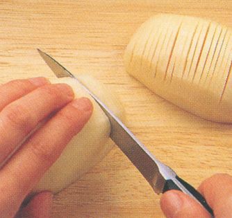 Slice off the base of the potato to steady it Make deep, thin parallel cuts across the potato, reaching almost to the bottom. The potato should hold together like the pages of a book.