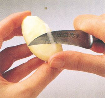 In a curving motion, cut the potato from top to bottom, turning as you go. The classic shape is oval, and about the size of a small egg.