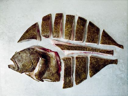 Fill your sink with cold water, ice and a handful of salt. Give the turbot a good rinse in the sink, then dry thoroughly with kitchen paper and place on a large chopping board.