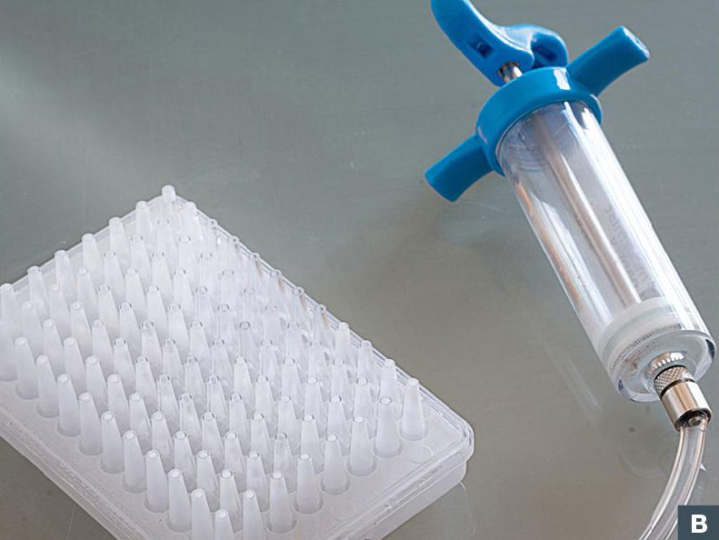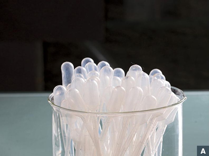 It is designed for distributing or removing small amounts of liquids, usually a drop at a time. It’s essential for see spherification. Since most pipettes only deliver a single stream of drops, making timing difficult, it’s useful to have a Finnpipette, which will deliver anywhere from 12 to 96 drops at a time. (B)