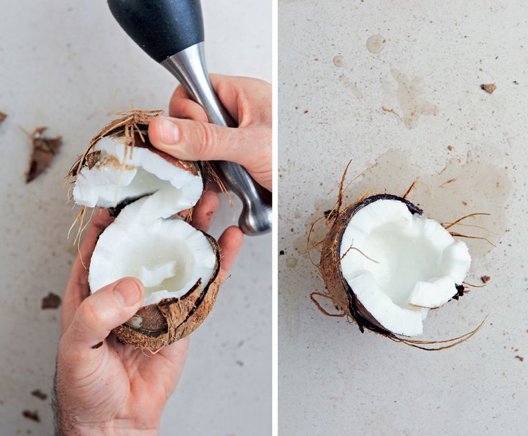Coconut is one of my favourite flavours, as either creamy coconut milk or freshly grated (shredded) or toasted flesh. You can buy desiccated (shredded) coconut from shops, but if you are in a more adventurous mood, I suggest you attempt to prepare your own grated fresh coconut – it’s infinitely better! The hard part is getting the flesh from the shell but it’s not impossible. Select a coconut that feels heavy – if it’s light then chances are the flesh may have deteriorated and dried out. In most countries apart from Asia, you’ll be buying a coconut with a hard brown shell – either hairy or, if trimmed, smooth. Hold the coconut firmly in one hand, or rest it on a towel on the work-top, and hit it firmly with a pestle, a hammer, or the back of a meat cleaver in the centre (think of the centre as you would the equator on a globe), rotating it a few degrees after every hit. Eventually, after it’s been rotated completely once or twice, you should hear it pop open. This will cause the liquid inside to drizzle or gush out – depending on how hard you’ve been hitting it. You can strain this liquid and drink it as long as it smells good. (Occasionally, I have opened a coconut only to discover the flesh has begun to rot a little – it smells very soapy – and have had to throw it away, which is very frustrating after all that effort.) The flesh should be white and firm with no trace of rot or discoloration. Once the coconut has popped, you’ll need to prise the two sides apart – a large blunt knife, screwdriver or oyster knife is good for this. To make it easier to remove the white flesh from the brown shell, you can place the two halves on a baking sheet in an oven set to 170°C (350°F/Gas mark 4) and bake until the flesh begins to shrink back from the shell a little, about 15 minutes. Using either the knife, screwdriver or oyster knife, you need to prise the flesh away fully from the shell. It may come away in one piece but usually it’ll break apart as you do so. Be careful though: it can be hard work and you don’t want your knife to slip and cut you. Once you have the flesh out, you can then grate it or peel it into strips using a potato peeler, then eat it as it is or toast it on a baking sheet at 160°C (325°F/Gas mark 3) until golden. Turn it frequently to ensure that it cooks evenly.